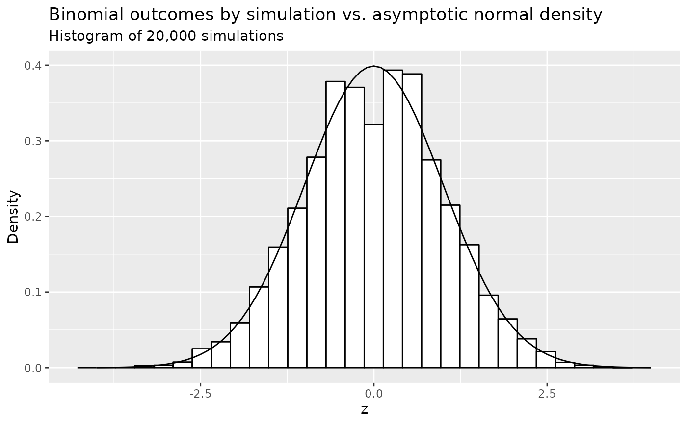 We do a quick 20,000 simulations and compare the density histogram of outcomes to the standard normal density. Assume \(r=1, d = 1, p_C=p_E=0.125, N=200\). We then compute \(\sigma\) as 0.047. Even for this not huge sample size the normal density fits quite well other than some flatness in the middle.
